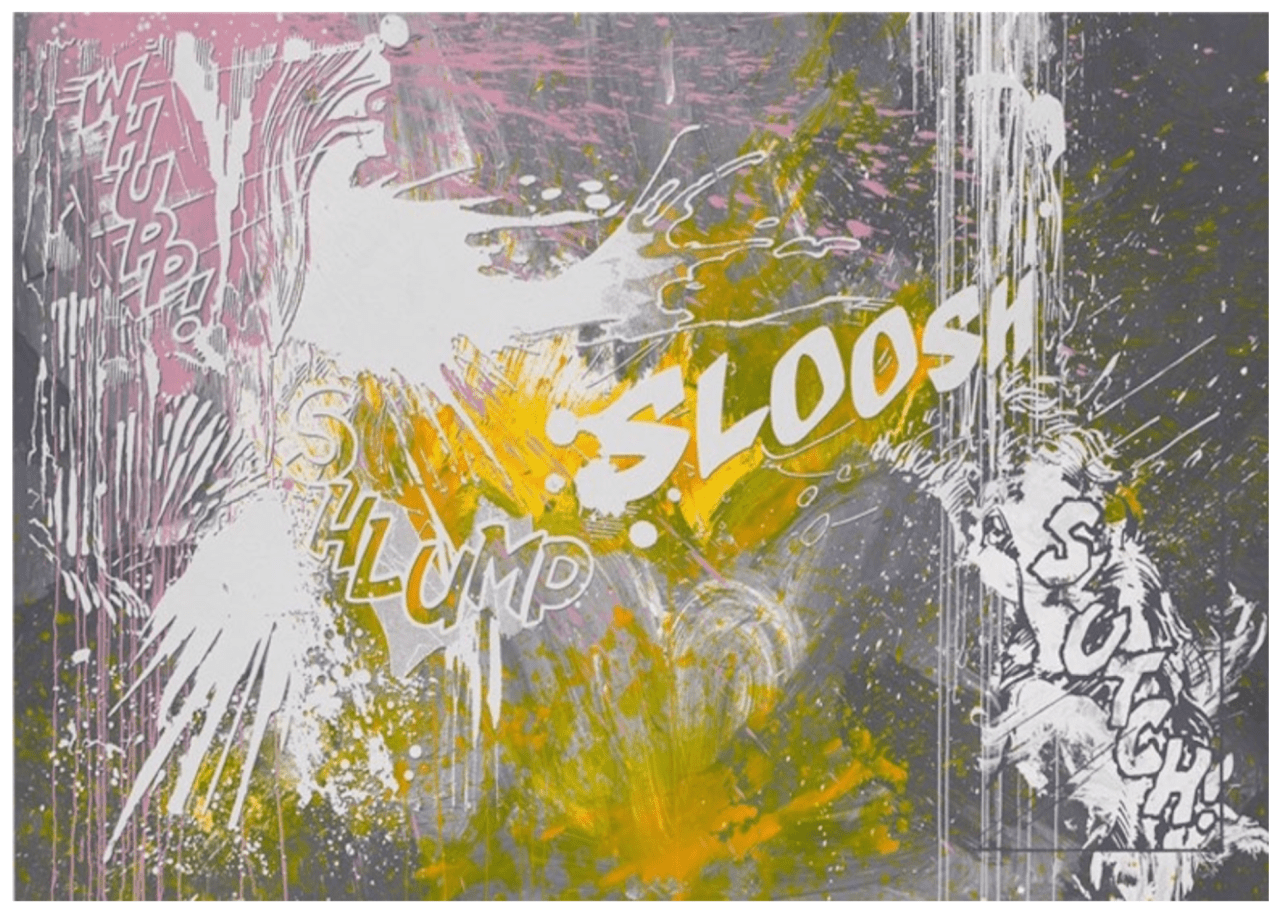 Snippets of Pop text are printed over performative splatters of paint. Plop, Glop, Splish, Slup. These “wet” words, once again demonstrate the artists’ fascination with sound mimesis whilst also alluding to the liquid quality of the paint that is poured, dripped and splattered across the surface of the works. Here Marclay uses the text of Pop Art to evoke the gesture of Action Painting. Action plus